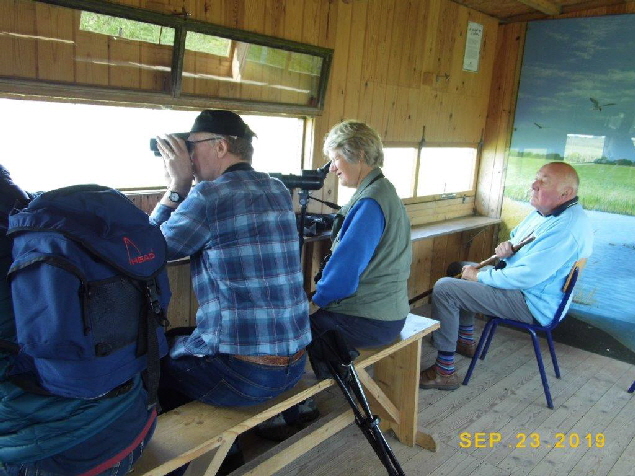 At the bend, turning left, and a short walk north, the favourite 360 Hide was reached, and it was in here that the group spent much of their time; telescopes and binoculars finding species such as: Black-Tailed Godwits, Redshank, flocks of Teal, Greylag Geese. However, the highlights from this hide were a small group of the lovely duck, the Shoveler: sifting with their massive ‘spatula’ bills in the water, searching for food. And a fabulous Curlew Sandpiper; observed feeding along the shore-line.